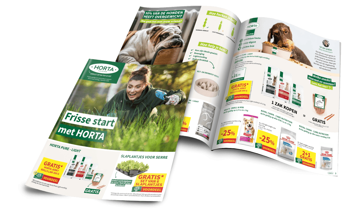 Hier kan je onze Horta folder bekijken die momenteel actief is. Daarin vind je een heleboel mooie artikelen en promoties die op dit moment geldig zijn in onze Horta-winkels. De thema’s zijn altijd actueel en heel uiteenlopend, van tuin, moestuin, gazon en alles voor je (huis)dieren.