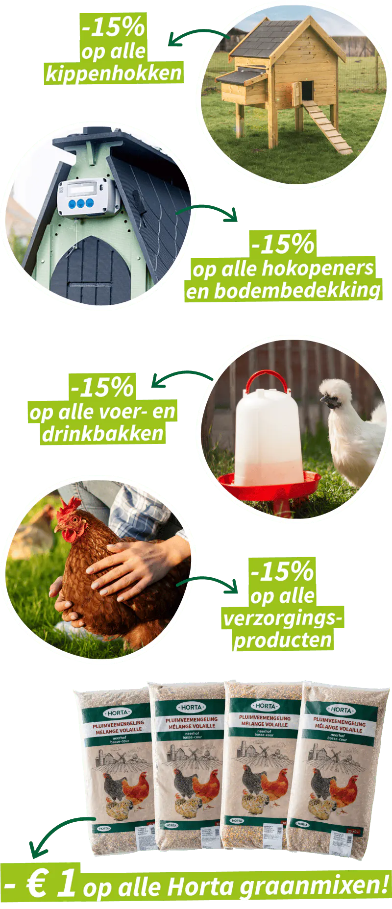 Om kippen te houden, heb je een paar zaken nodig. Het zijn geen veeleisende beestjes, maar ze hebben natuurlijk wel genoeg ruimte nodig, een proper hok en een drink- en voederbak. Tijdens de Horta Kippendagen geniet je van 15% korting op alle kippenaccesoires! Dus ... waar wacht je nog op?