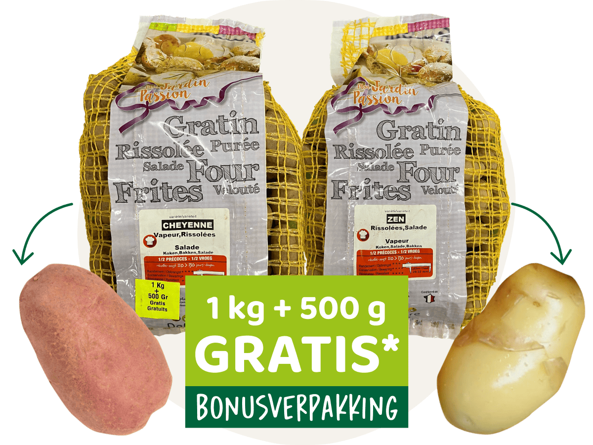 Dit jaar zetten we twee pareltjes van patatten in de kijker: Cheyenne (halfvroeg, rode schil, vastkokend) en Zen (vroeg, gele schil, licht bloemig). Om deze schatjes van patatjes te laten uitblinken, pakken we tijdens de Horta Patattendagen ook graag uit met een promotie: koop 1 kg Zen of Cheyenne en krijg er 500 g gratis* bij!
