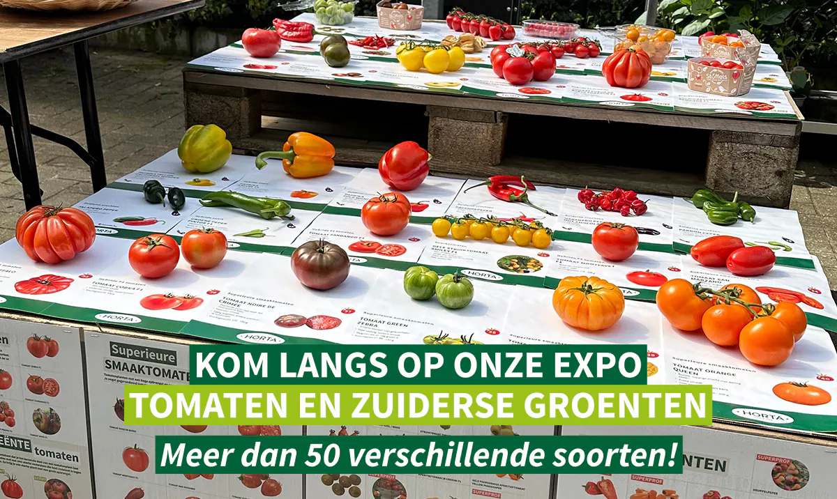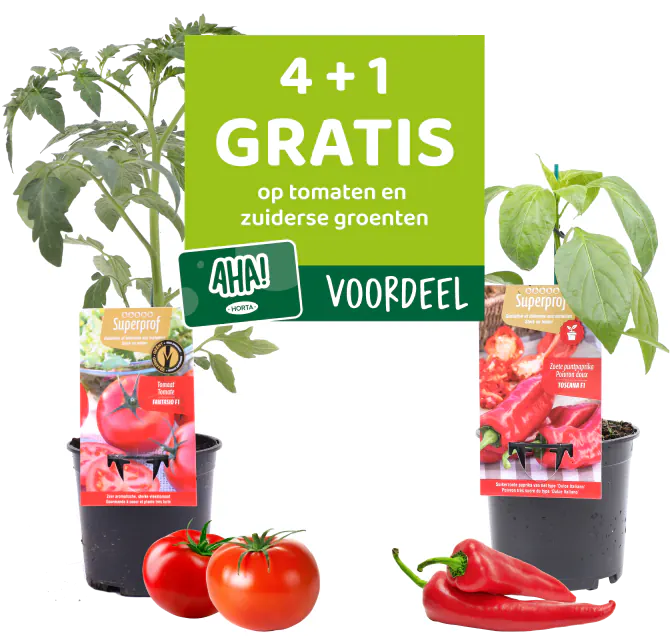 *Actie geldig bij aankoop van tomatenplanten en zuiderse groenten Ø 10,5 en Ø 13 cm tijdens de Horta Tomatendagen (22/04 t.e.m. 25/04) en op vertoon van je AHA!-klantenkaart. Goedkoopste plant gratis. Niet cumuleerbaar met andere acties.