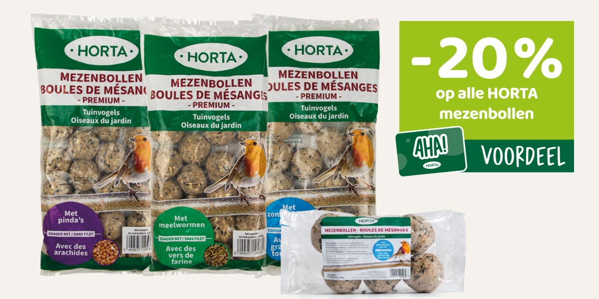 Elke tuinvogel lust wel een mezenbol en bij Horta vind je dan ook nog eens verschillende soorten (met pinda's, zonnebloempitten of meelwormen). Een must have is natuurlijk wel een mezebolhouder om die lekkere snack in te presenteren.