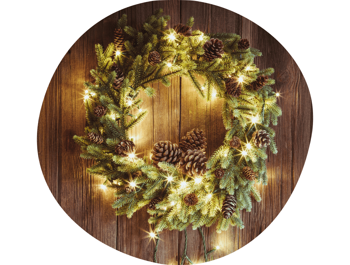 Une valeur ajoutée absolue pour une couronne de Noël chaleureuse est l’éclairage ! Le plus simple, bien sûr, est d’opter pour un éclairage à piles ; vous n’aurez ainsi pas à dissimuler des cordons ou à placer votre couronne près d’une prise de courant. Un micro-éclairage permet de créer un effet subtil, tandis qu’un éclairage compact ou de base apporte un peu plus de lumière et d’éclat.