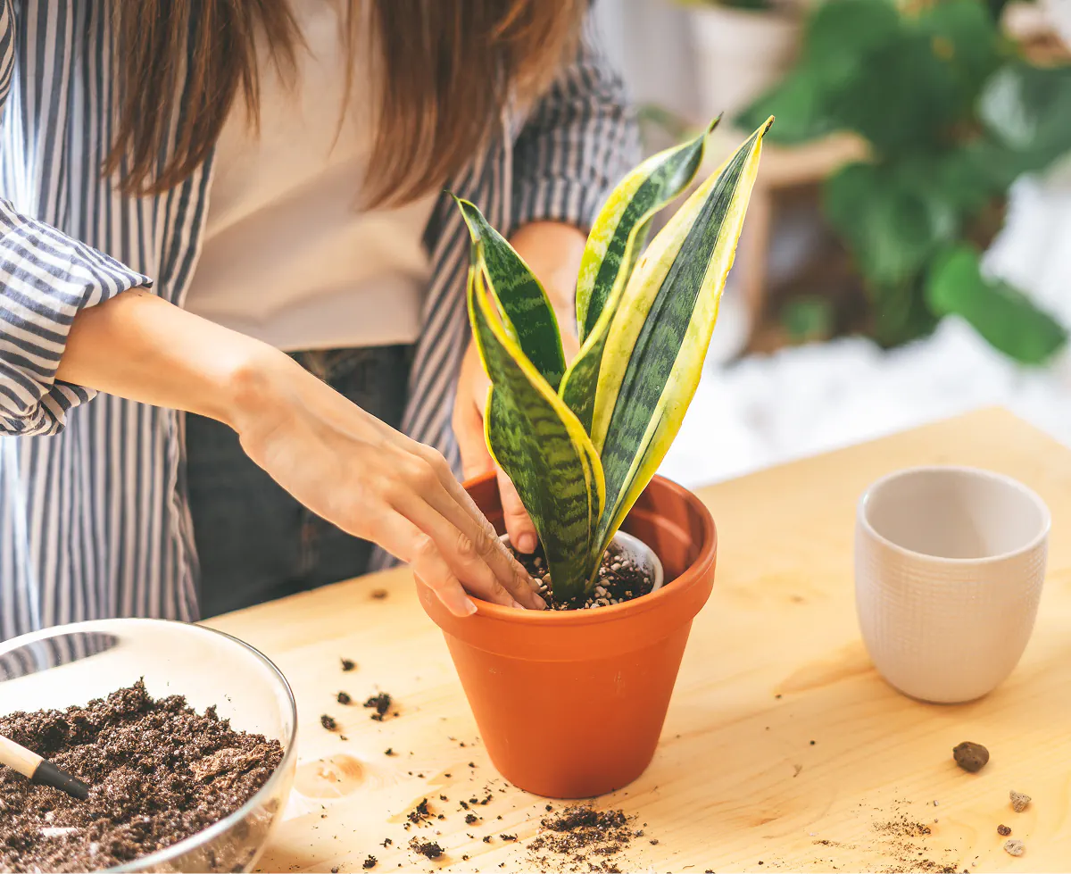Vous pouvez bouturer une sansevieria de manière classique : sortez la plante du pot, placez-la dans un nouveau et remplissez de terre et d’eau.