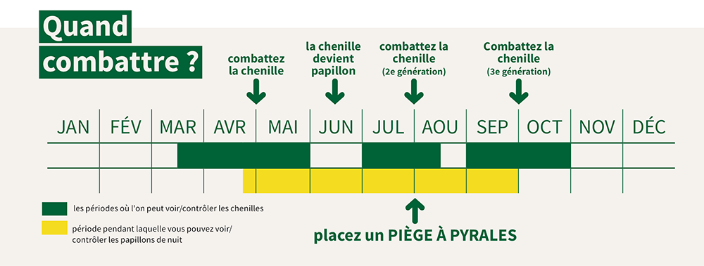 C’est lorsque les chenilles grignotent les feuilles que vous pouvez les combattre le plus efficacement. Vous avez jusqu’au changement en chrysalide pour lutter contre les chenilles ravageuses. Une fois le changement en chrysalide amorcé, vers la fin mai, votre seule option pour limiter la propagation de la pyrale du buis consiste à couper les foyers de cocons de chrysalides et à éliminer ainsi les chenilles et les parties abîmées de la plante.