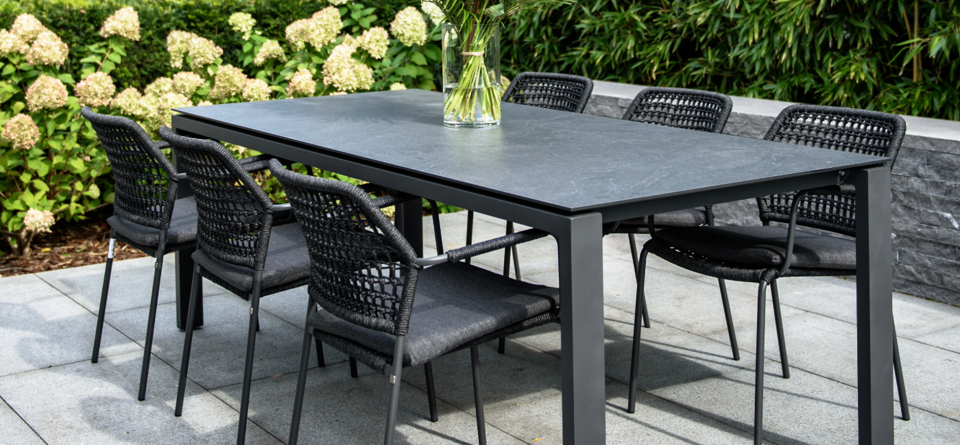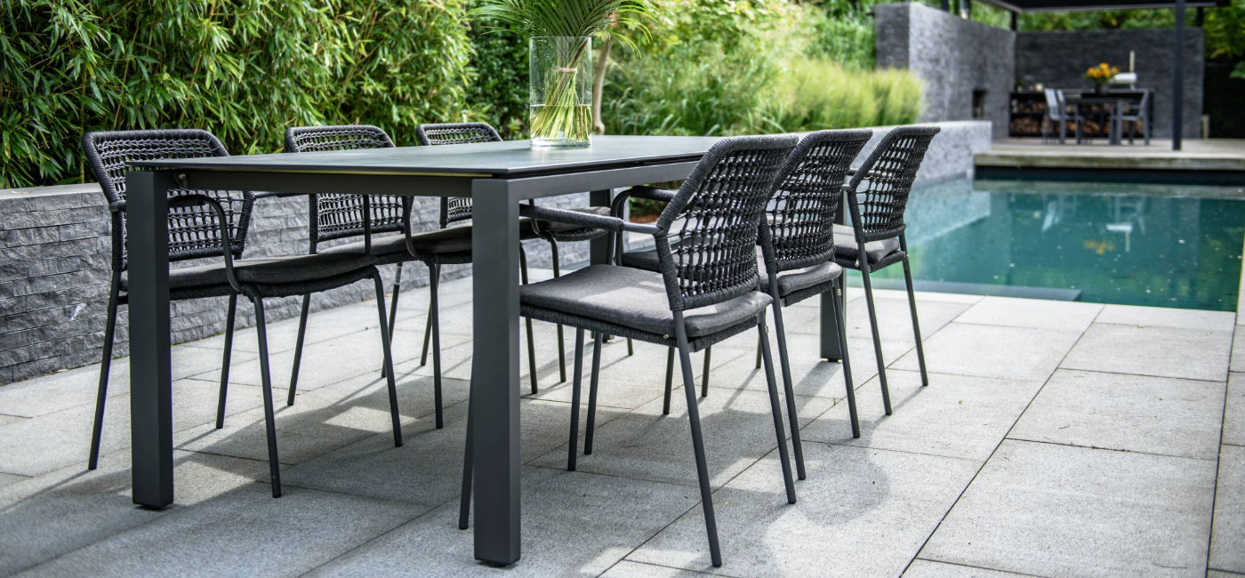 Le plateau en ardoise anthracite confère à la table Goa une allure moderne, avec des veines subtiles qui lui donnent un aspect naturel. Le piétement en anthracite revêtu de poudre permet également de s'asseoir aux extrémités, offrant ainsi des places supplémentaires à tout moment. Grâce aux matériaux utilisés, cette table peut rester à l'extérieur toute l'année.