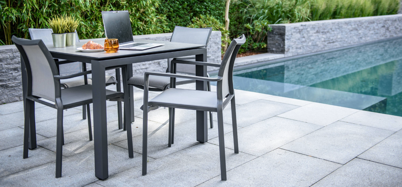 Met dit tafelconcept bepaal je zelf hoe je ideale eettafel eruitziet. Het Goa frame is verkrijgbaar in verschillende maten en heeft een antraciet look die perfect past bij vele 4 Seasons Outdoor eetstoelen.