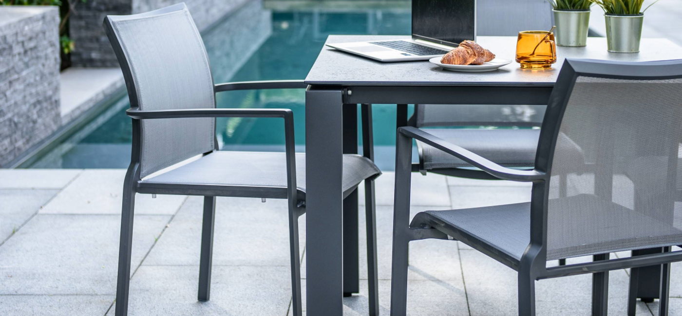 Combineer de eettafel met de Melbourne stapelstoelen van aluminium, die tal van voordelen bieden: ze zijn licht van gewicht, vereisen weinig onderhoud, kunnen compact worden gestapeld, hebben een moderne uitstraling, hebben geen kussens nodig en zijn bovendien comfortabel.