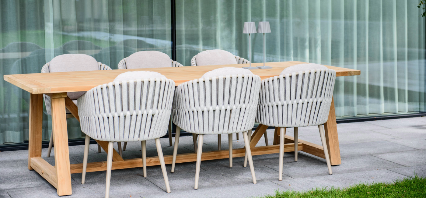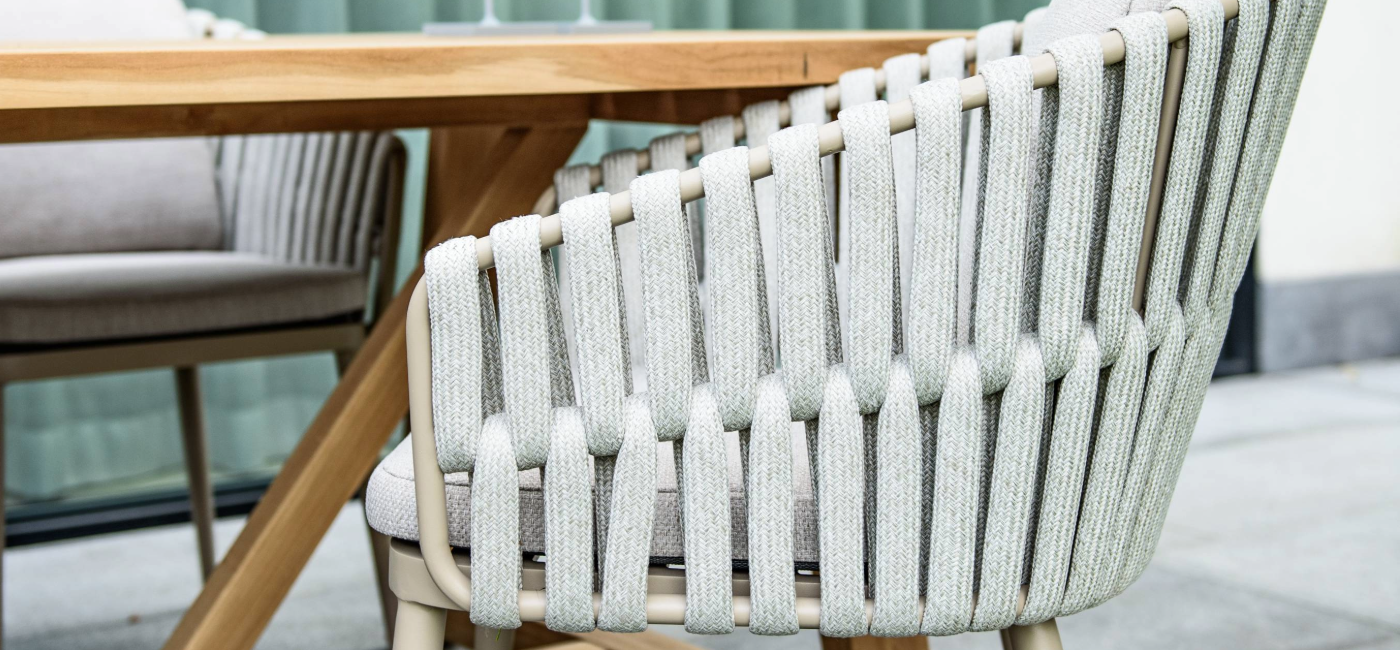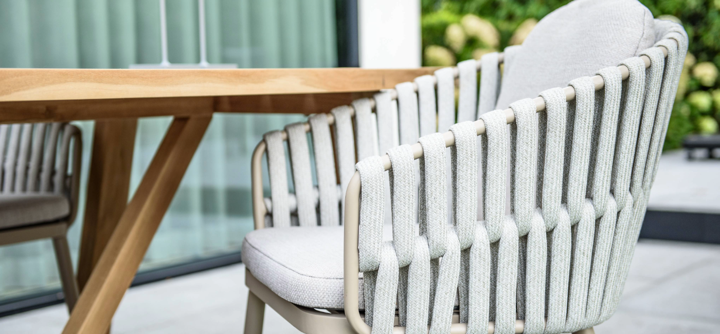 Combineer deze tafel perfect met de Eva dining stoel voor een harmonieuze buitenruimte. De Eva stoel heeft een eigentijds aluminium frame met een matchende latte rope bekleding, compleet met zachte kussens voor optimaal comfort. Het dikke rope vormt een prachtige combinatie met het latte frame en zorgt samen met de kussens voor een heerlijk zitcomfort. Een kleur die het best kan worden omschreven als smaakvol beige.