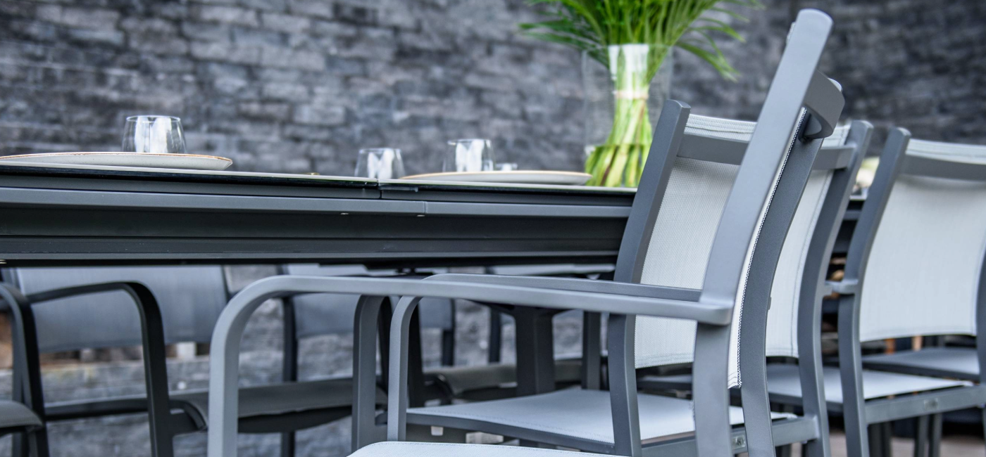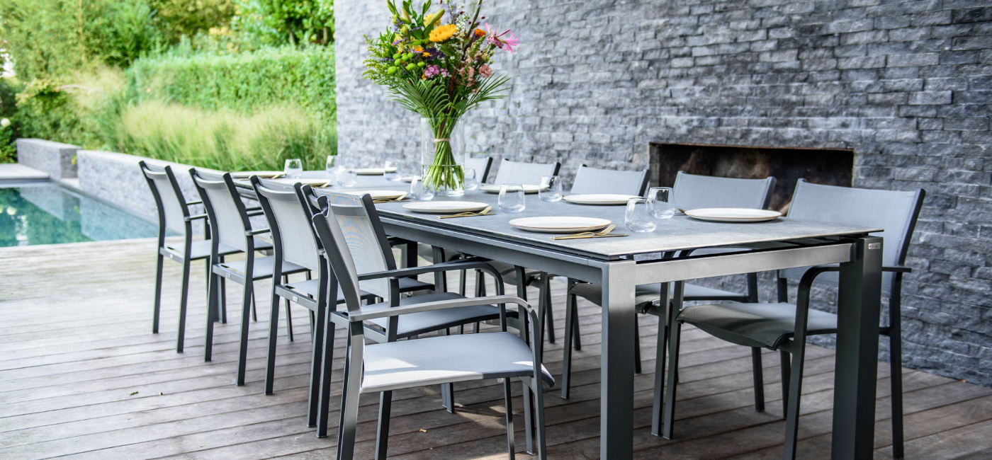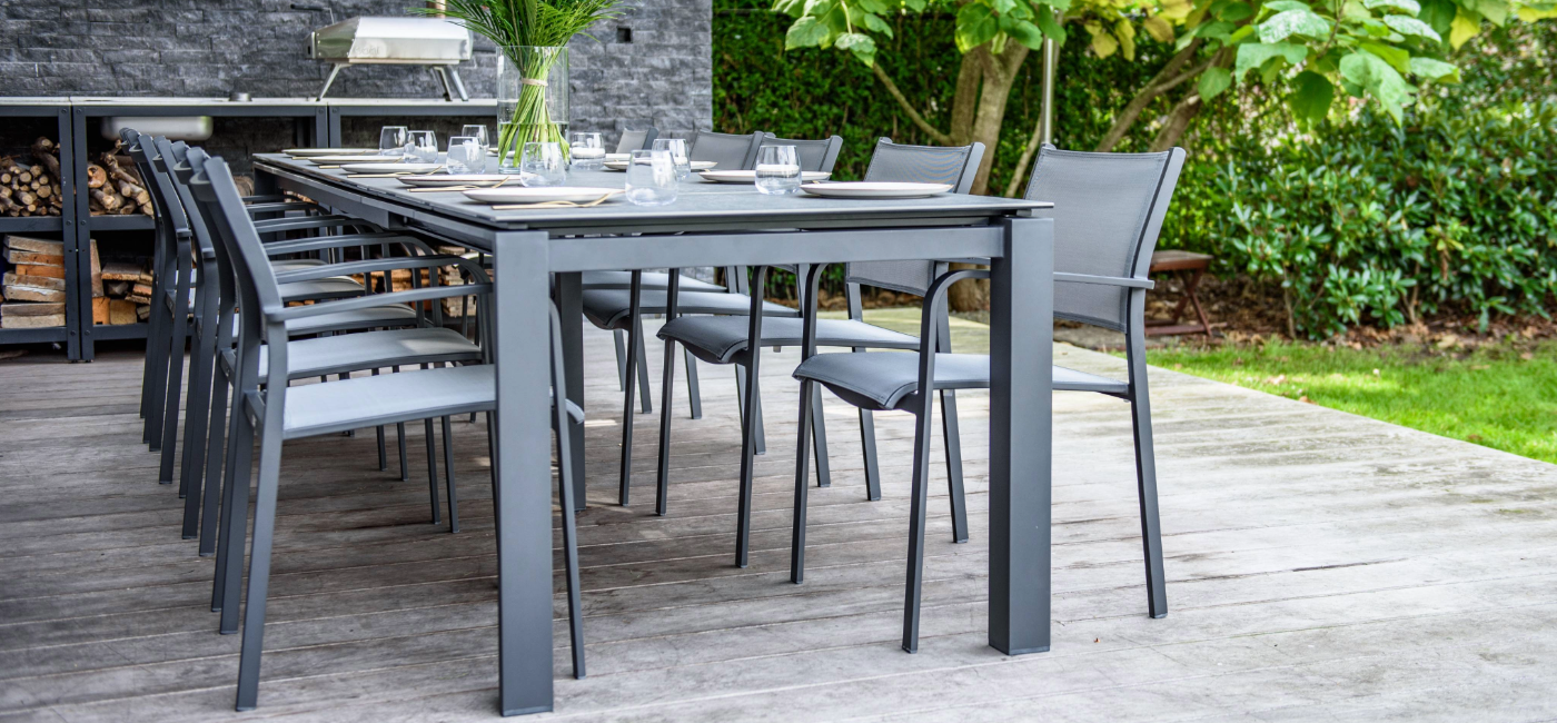 Combineer deze veelzijdige tafel met de elegante Tosca eetstoel. Vervaardigd van weerbestendige materialen, zoals textileen voor het zit- en ruggedeelte, biedt deze stoel ongeëvenaard comfort. Het aluminium frame maakt de stoel onderhoudsarm en dankzij het stapelbare ontwerp bespaar je ruimte wanneer dat nodig is.